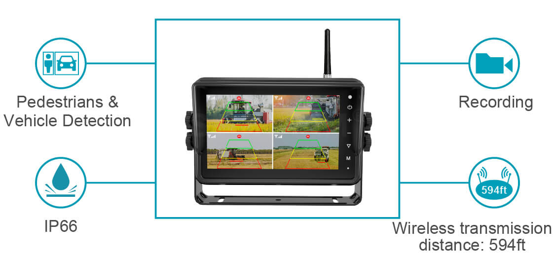STONKAM 7-inch intelligent pedestrian & vehicle detection and warning wireless vehicle video-recording and monitoring display integrates wireless transmission technology, AI pedestrian & vehicle detection algorithm and video recording function. It is easy to install and supports real-time detection of pedestrians and vehicles around the vehicle, promply reminding drivers of potential risks and avoiding collisions and helping to ensure driving safety! The display features a waterproof shell, video recording and touch screen capabilities; It offers a long-range transmission distance of up to 590ft in barrier-free condition, with stable signal and interference resistance, suitable for various vehicles including trucks, forklifts, and mining vehicles.